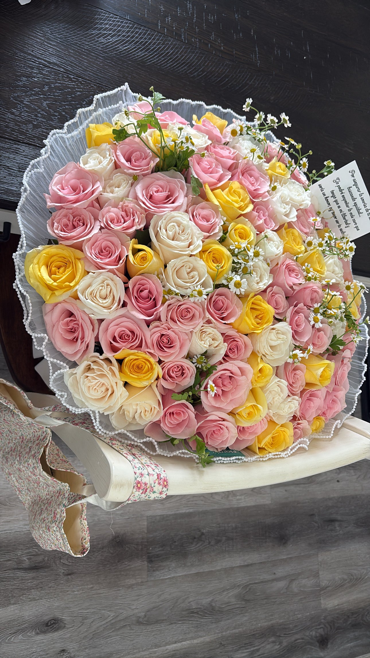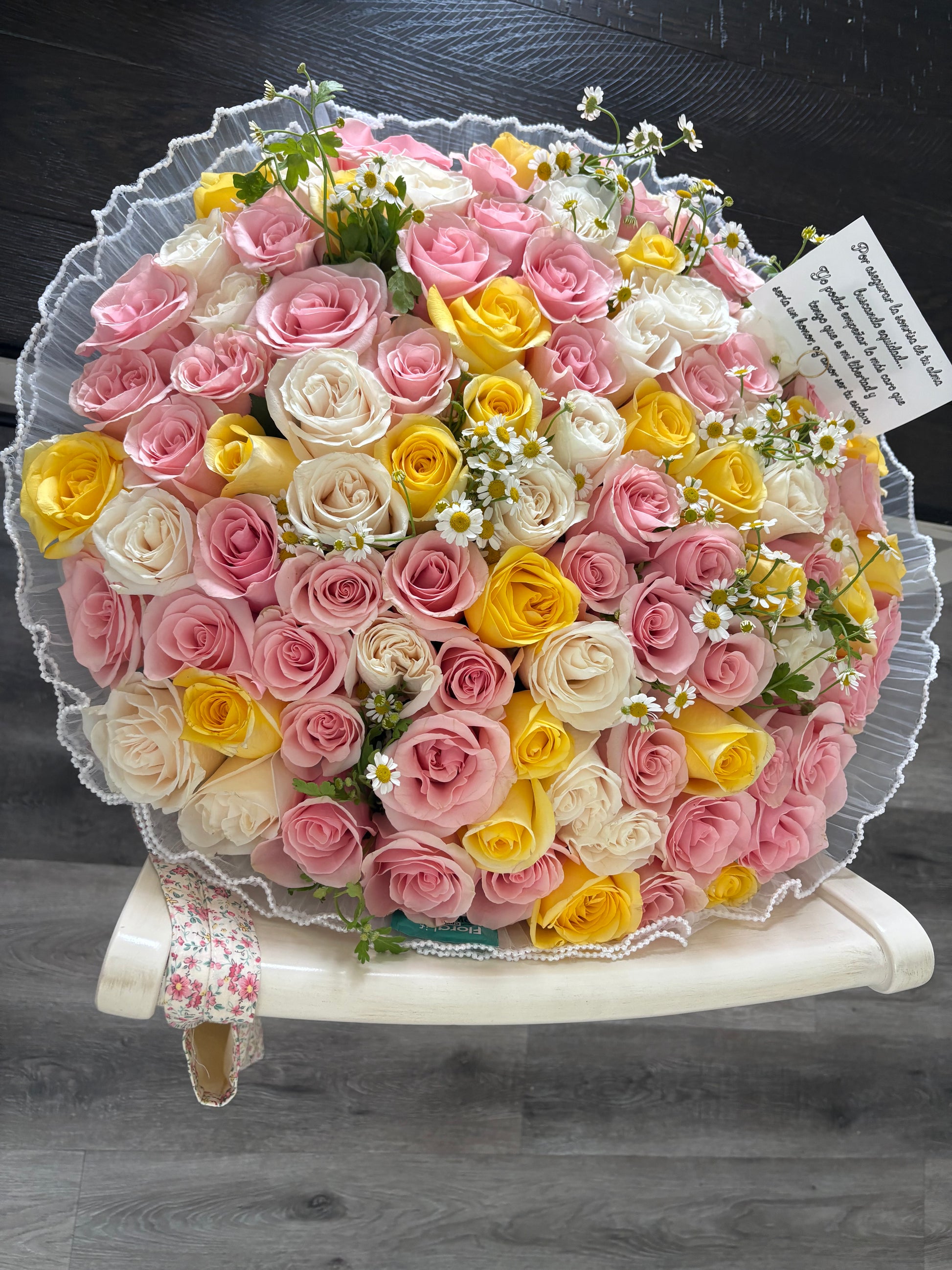 Una mezcla suave y elegante de rosas acompañadas de delicada manzanilla para un toque fresco y natural 🌼✨